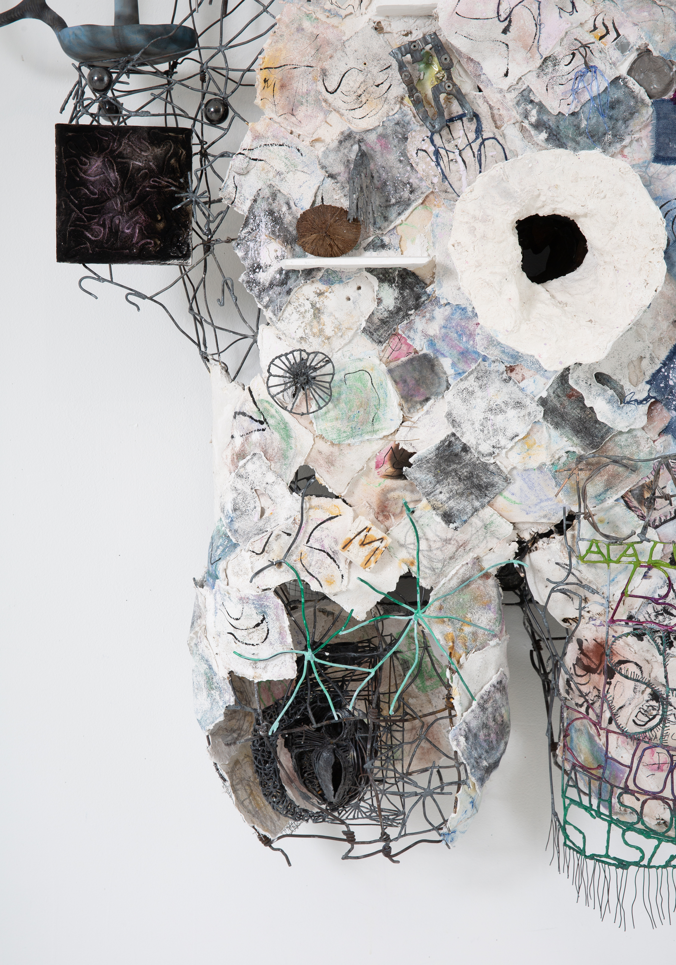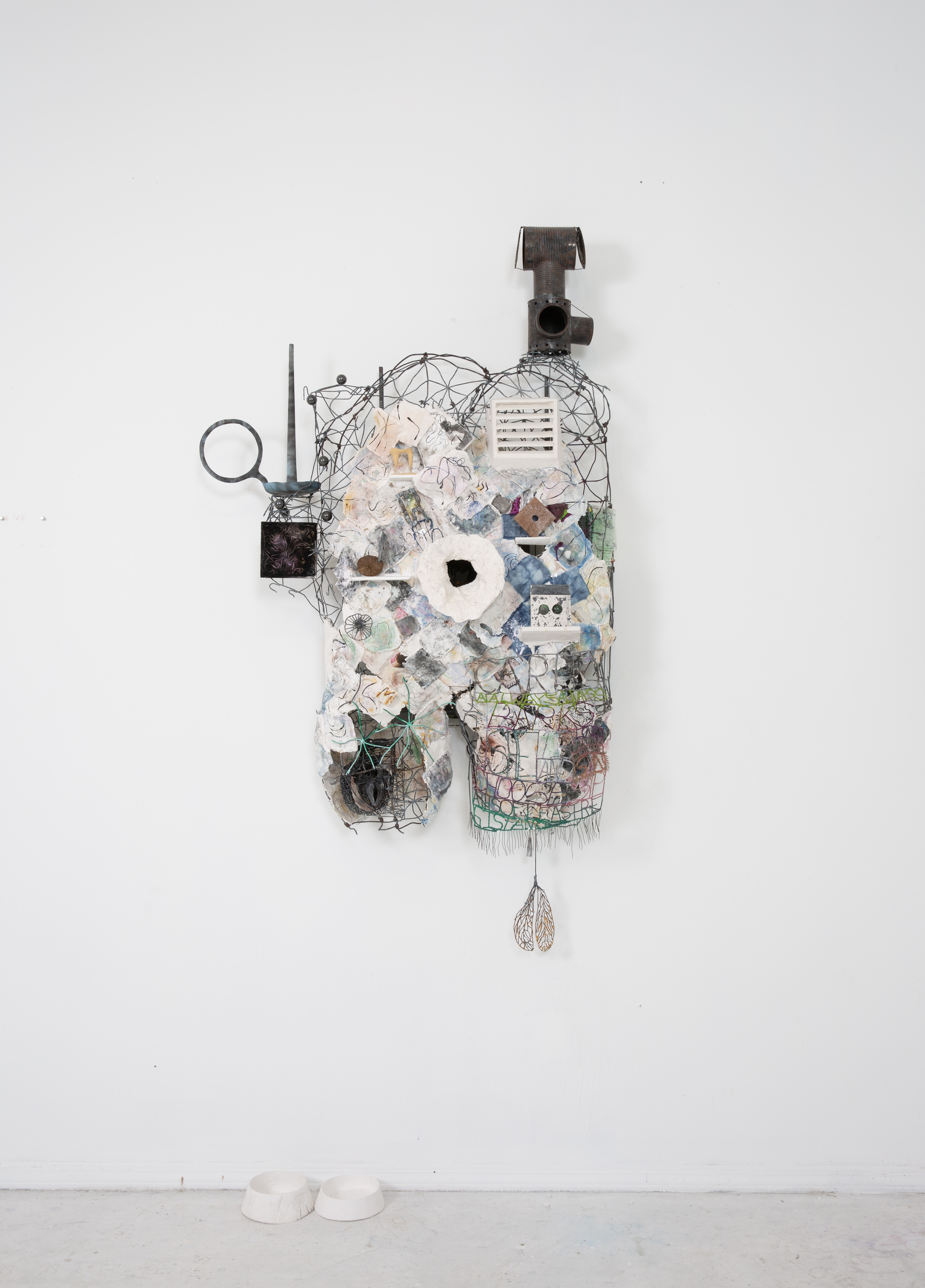 steel, plaster, carved salt cedar, walnut bass wood, coconut, steel cans, paint, rust, soot, glass, mirror, ink, paint