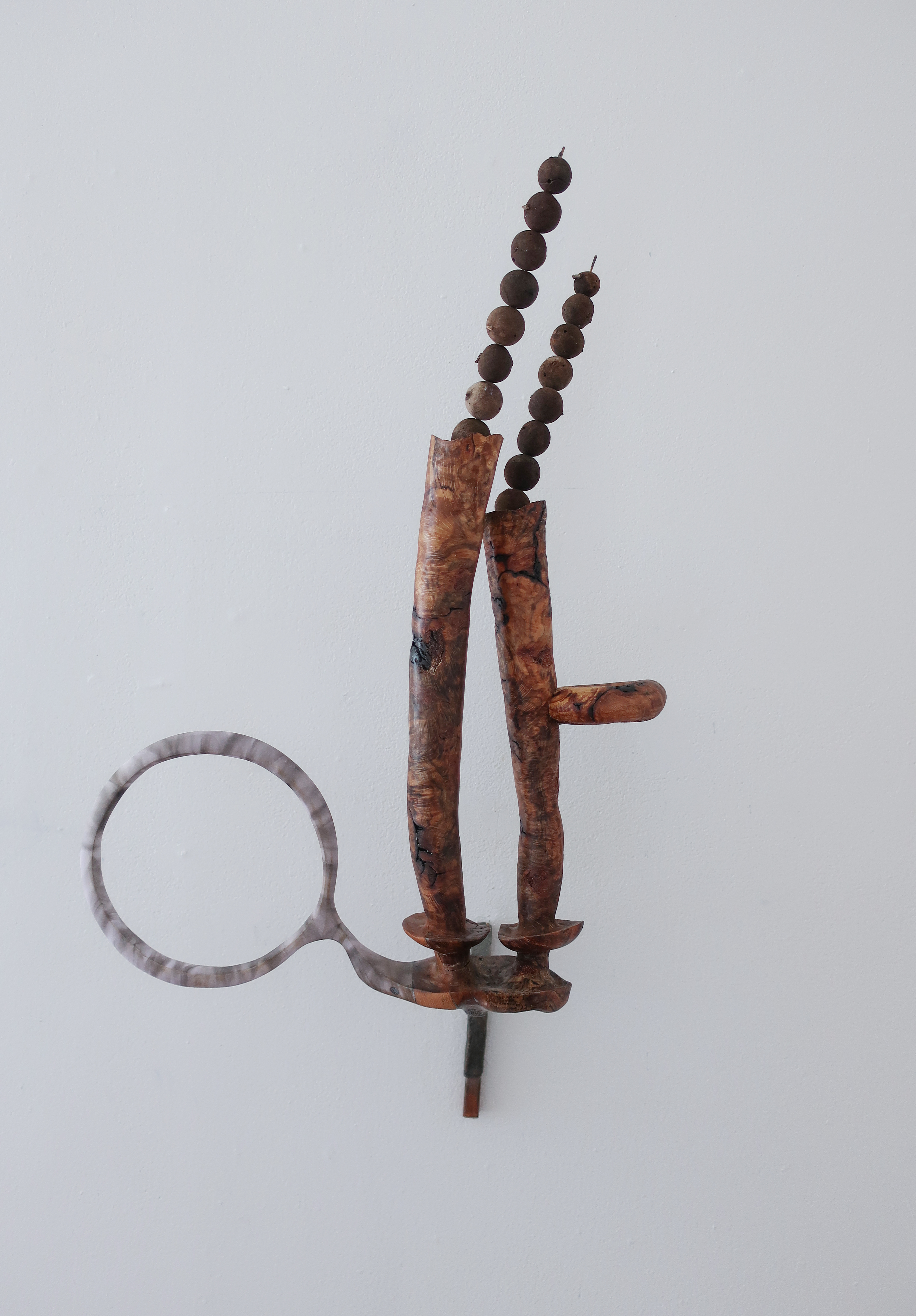 Carved willow oak burl, live oak galls, incense sticks, painted and smoked poplar, sawdust, aluminum screws, steel bracket, danish oil